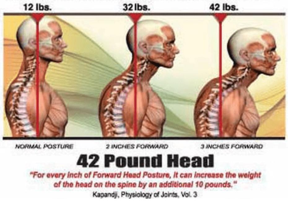 You will also see in img 3 below that this causes the head to be pulled forward, and for every inch your head is forward, you add roughly 10lbs of pressure to your spine, adding to the discomfort being caused by the tightening of the chest.